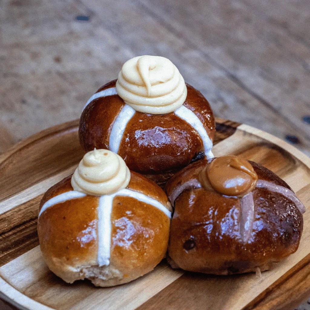Hot cross buns, the Bam Bam way (aka, delicious). Expect cult-favourite flavours like Biscoff alongside their signature Easter custard bombs.